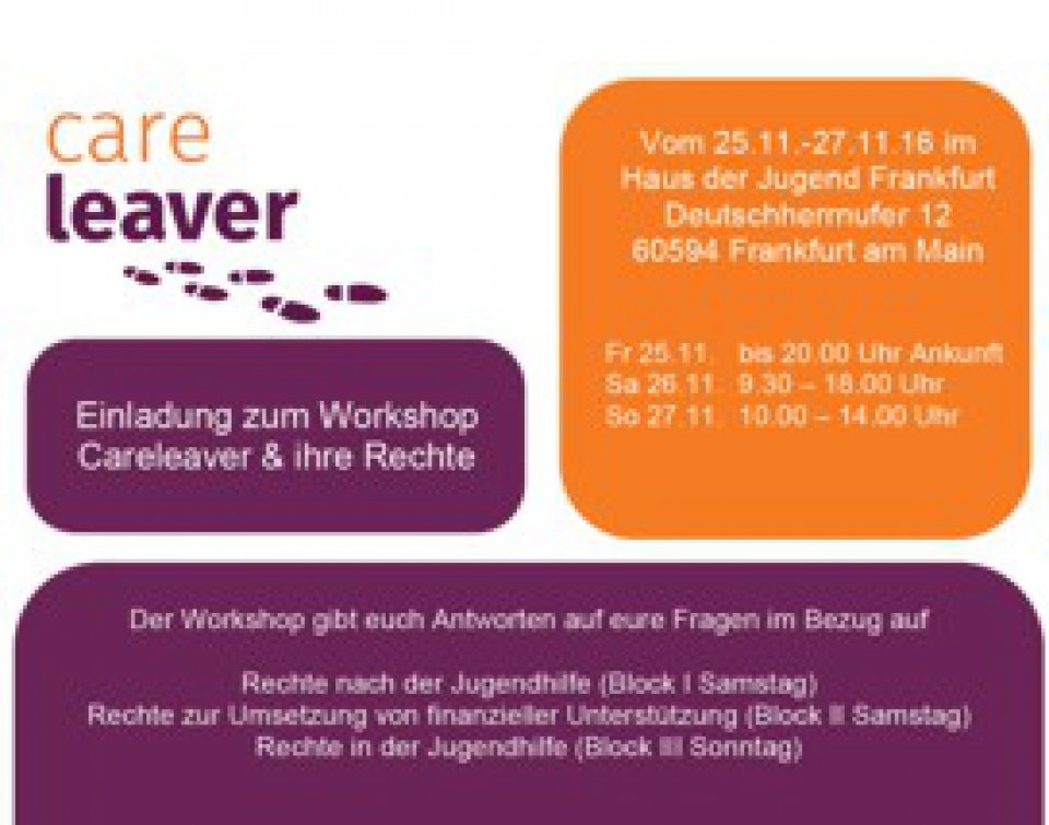 Der Careleaver e.V. (ein Zusammenschluss von jungen Menschen, die die Fürsorge durch stationäre Jugendhilfe verlassen) veranstaltet vom 25.-27.11.2016 in Frankfurt am Main einen Workshop für junge Careleaver. Darauf weisen wir gern hin: Der Workshop gibt euch Antworten auf eure Fragen im Bezug auf Rechte nach der Jugendhilfe (Block I Samstag), Rechte zur Umsetzung von finanzieller Unterstützung (Block II Samstag) und Rechte in der Jugendhilfe (Block III Sonntag). Teilnehmen können alle Careleaver zwischen 16 und 35 Jahren, die in der Jugendhilfe sind oder waren. Die Veranstaltung ist kostenlos. Fahrtkosten & Unterkunft werden übernommen. Anmeldungen richten sich bitte mit dem Betreff “Teilnahme Rechteworkshop” an info@careleaver.de