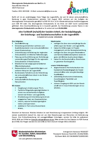 Zur Verstärkung des Teams der überregionalen Ombudsstelle in Niedersachsen, sucht der Berni e. V. zum 01.04.2026 eine Fachkraft (m/w/d) der Sozialen Arbeit, der Sozialpädagogik oder der Erziehungs- und Sozialwissenschaften in der Jugendhilfe als Geschäftsführung. Die Anstellung erfolgt in Vollzeit und wird in Anlehnung an TV-L S vergütet. Dienstort ist Hannover, mobiles Arbeiten ist nach Vereinbarung in begrenztem Umfang möglich.